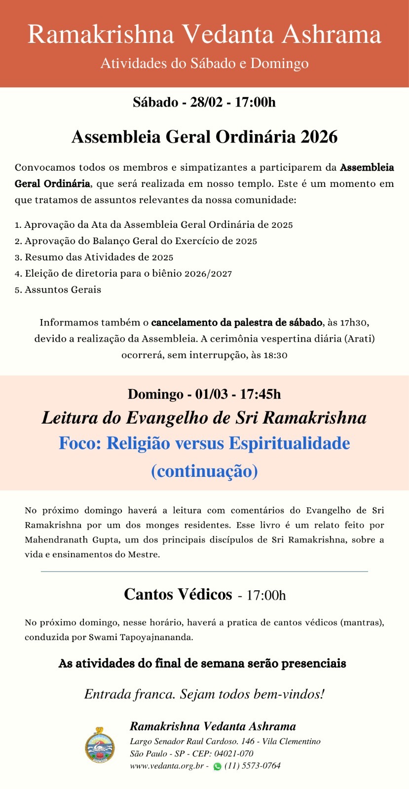 O Ramakrishna Vedanta Ashrama de São Paulo foi fundado em 1974 e oficialmente afiliado à Ordem Ramakrishna, com sede em Belurmath, Índia, em 1999.