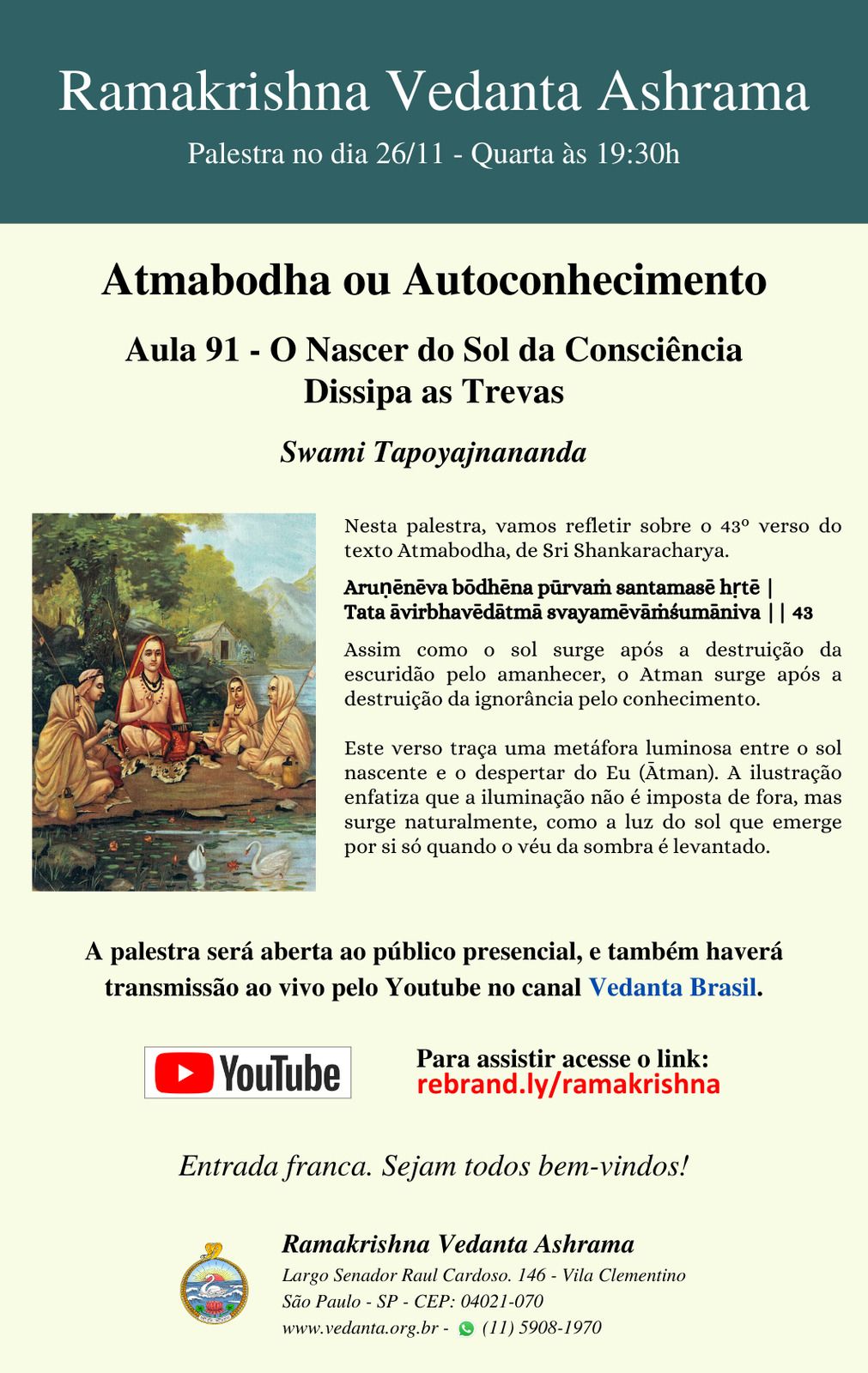 Swami Nirmalatmananda, Swami Jitananda, Swami Tapoyajnananda são os monges residentes do centro .