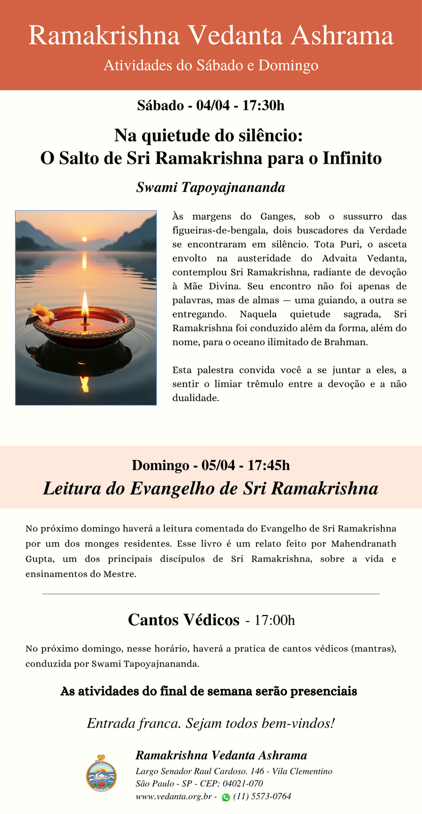 O Centro promove a filosofia Vedanta por meio de palestras, aulas semanais sobre as Escrituras, publicações, cânticos devocionais, aconselhamento espiritual,
