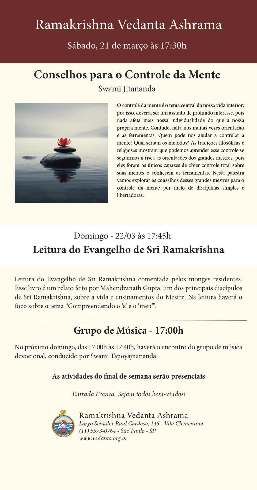 meditação, retiros espirituais periódicos, aulas e cursos de ioga, biblioteca, serviço filantrópico e celebração de festas religiosas.