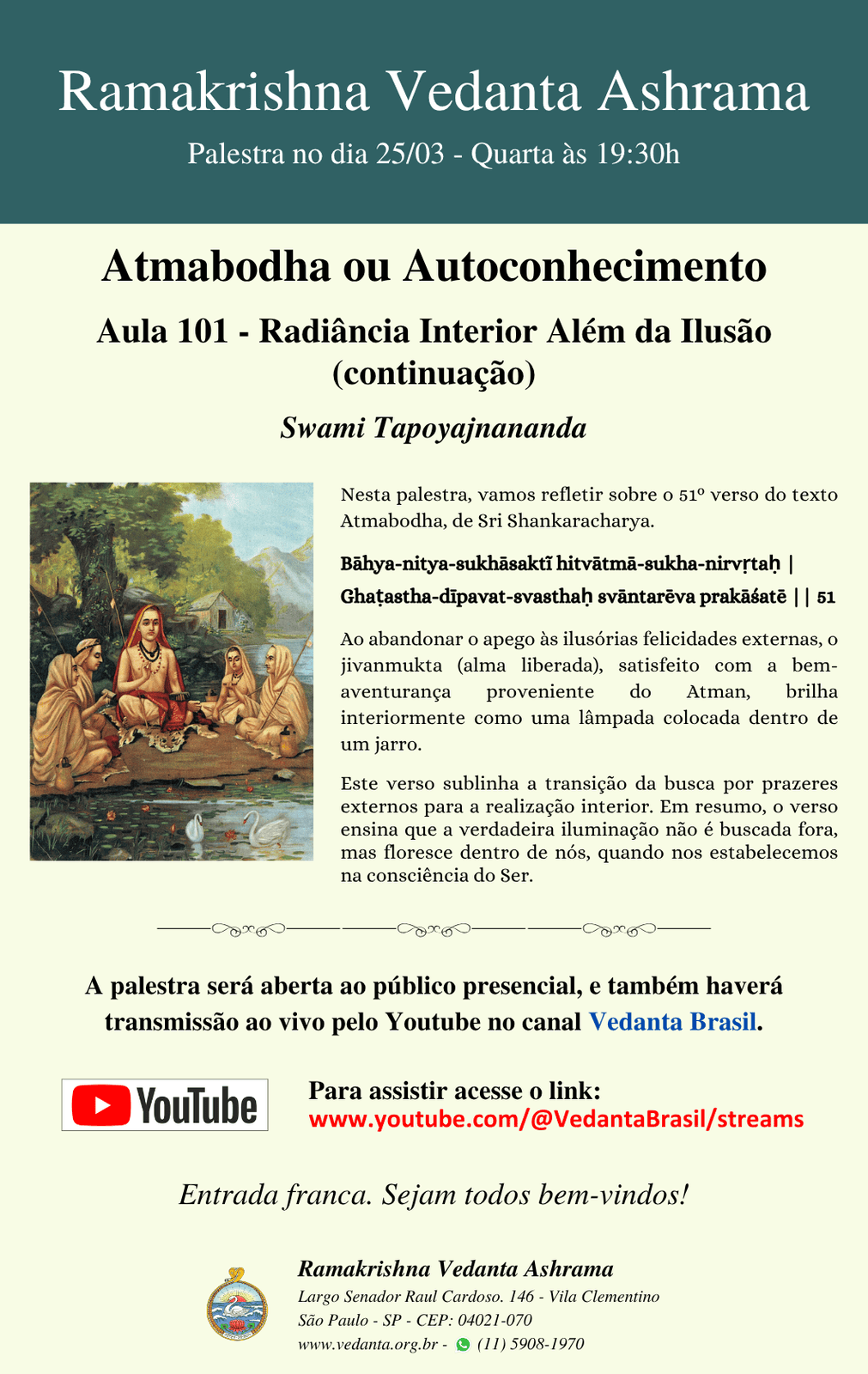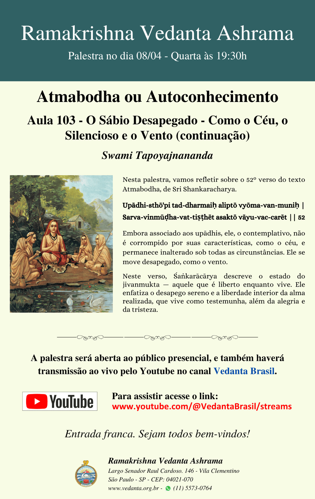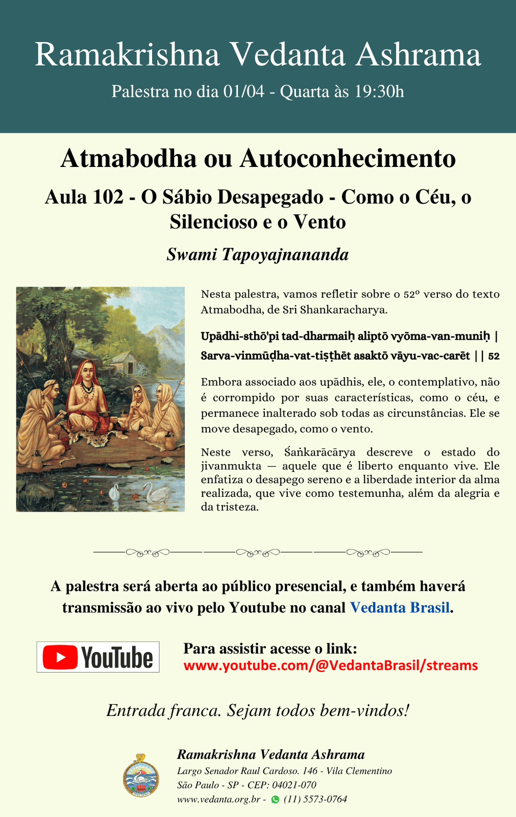 Swami Nirmalatmananda, Swami Jitananda, Swami Tapoyajnananda são os monges residentes do centro .