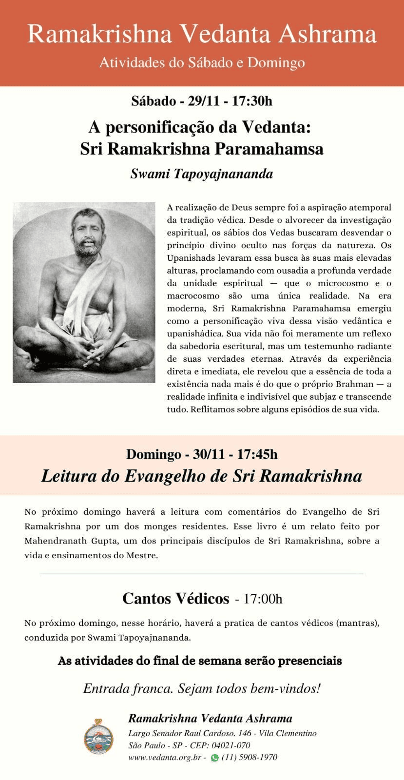 O Ramakrishna Vedanta Ashrama de São Paulo foi fundado em 1974 e oficialmente afiliado à Ordem Ramakrishna, com sede em Belurmath, Índia, em 1999.